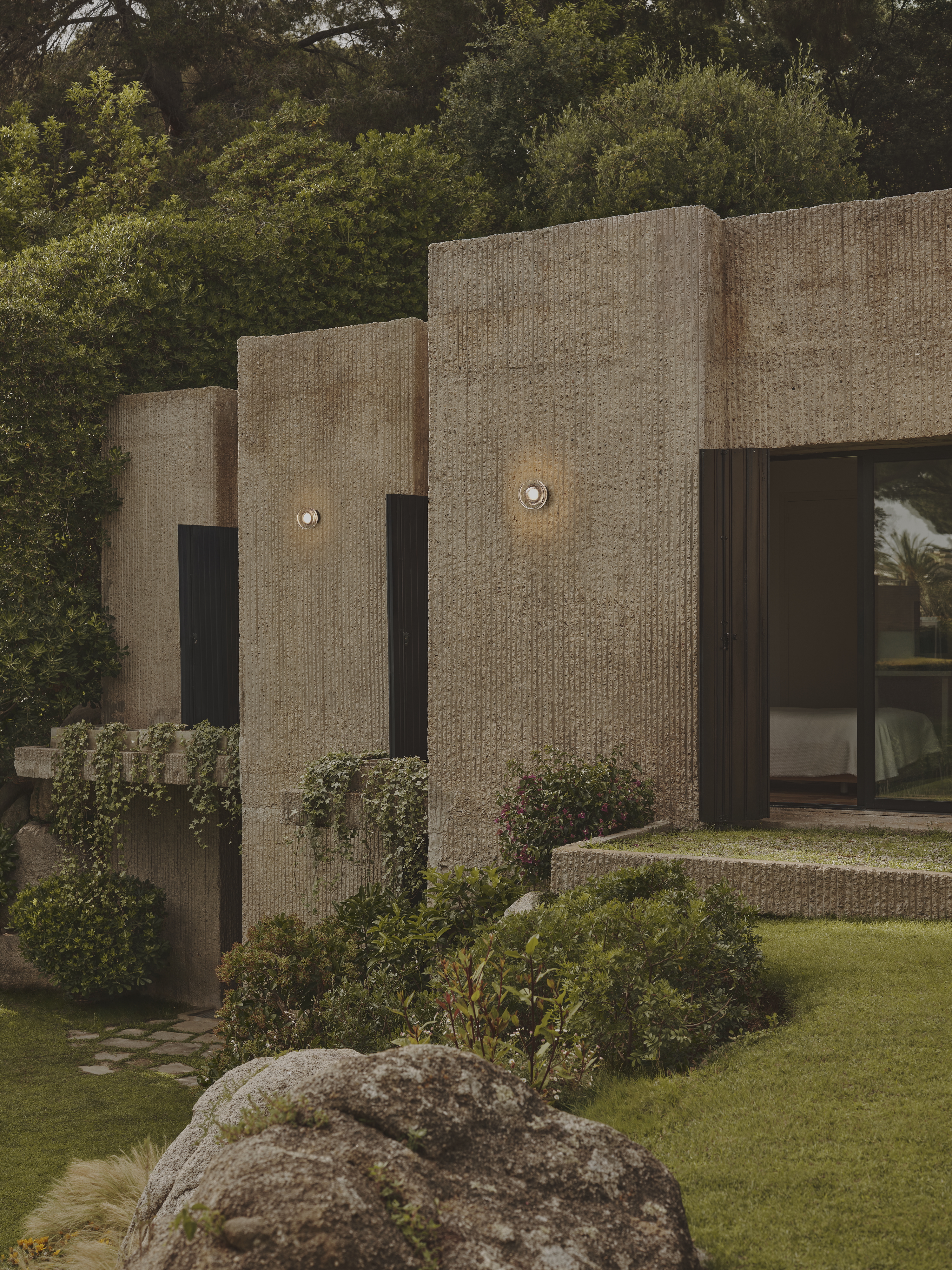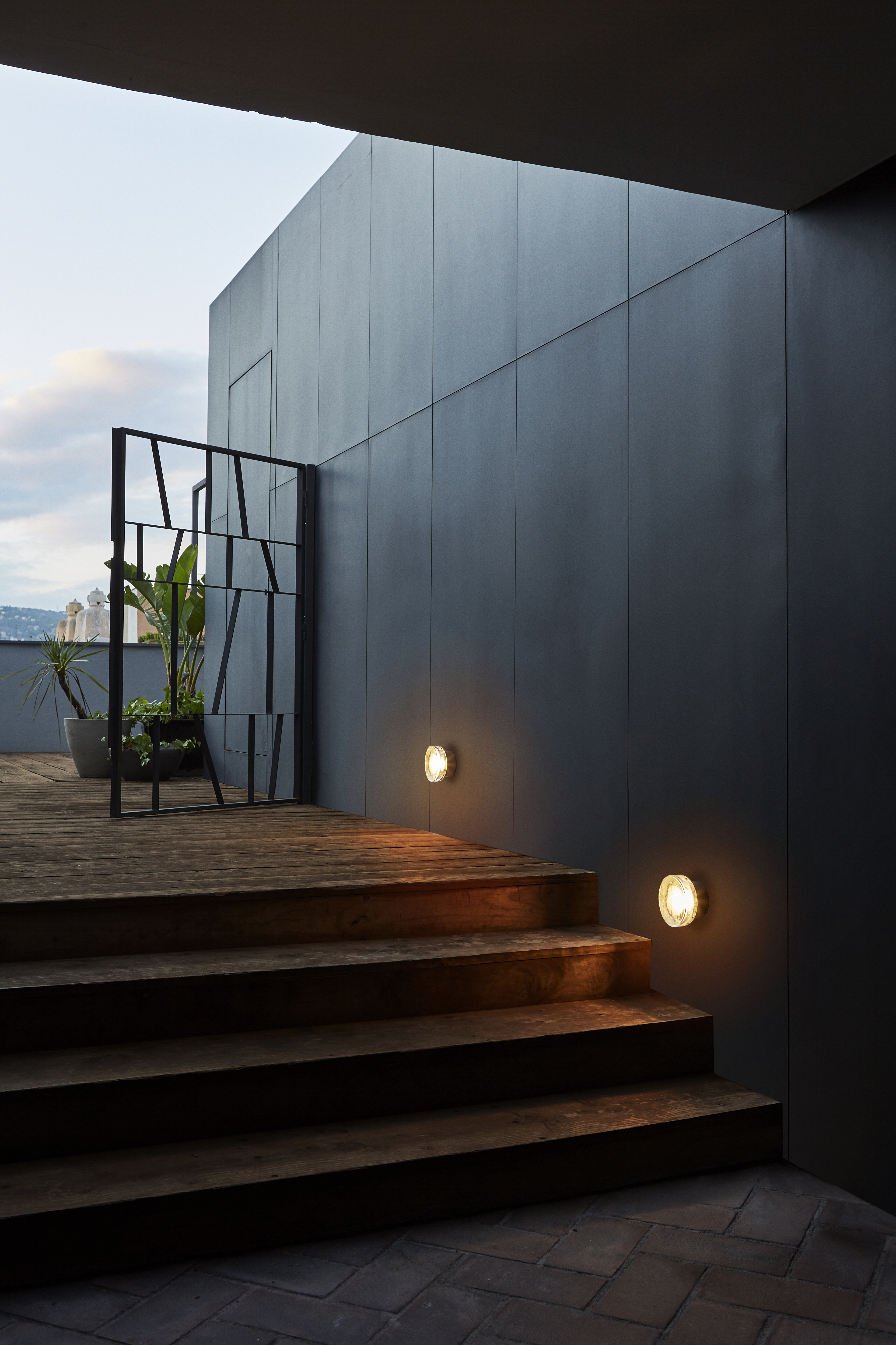 Compact indoor and outdoor wall lamp with a pressed glass diffuser. Its undulating shade covers the light, blurring it. It doesn’t settle for just providing light, it also manages to create an ambiance.